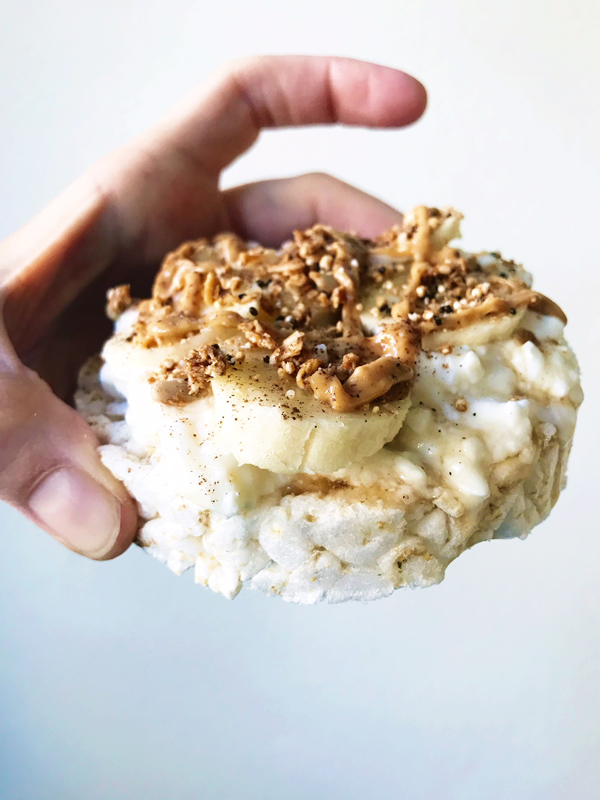 - Plain rice cake with low fat cottage cheese, Waldenfarms maple walnut syrup, 15-20 g fruit (bananas today), 3 grams Purely Elizabeth granola (my all time fave), 3 grams peanut butter drizzle (I leave my Kirkland natural in the pantry instead of the fridge), and a sprinkle of kosher salt and cinnamon. This is a major staple for me. It’s small, YES. Just enough to get me through the gym without burning through too many macros before I REALLY want them.