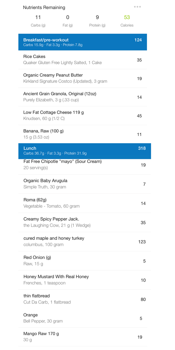 Below is my food diary from My Fitness Pal. I was going to clear out the top for the sake of this post, but the truth is, I love to pre-log my day but leave a tiny bit of wiggle room. So I can decide as the day progresses if I want to add more turkey at lunch or more chicken at dinner… a rice cake after the gym when I planned to skip a snack… or a little more mango in my wrap etc. I could EASILY add more protein powder to my dessert and enjoy a few extra grams of granola. If I choose something that takes me negative a couple of fat, I’ll just make a point to leave about twice that in carbs.
