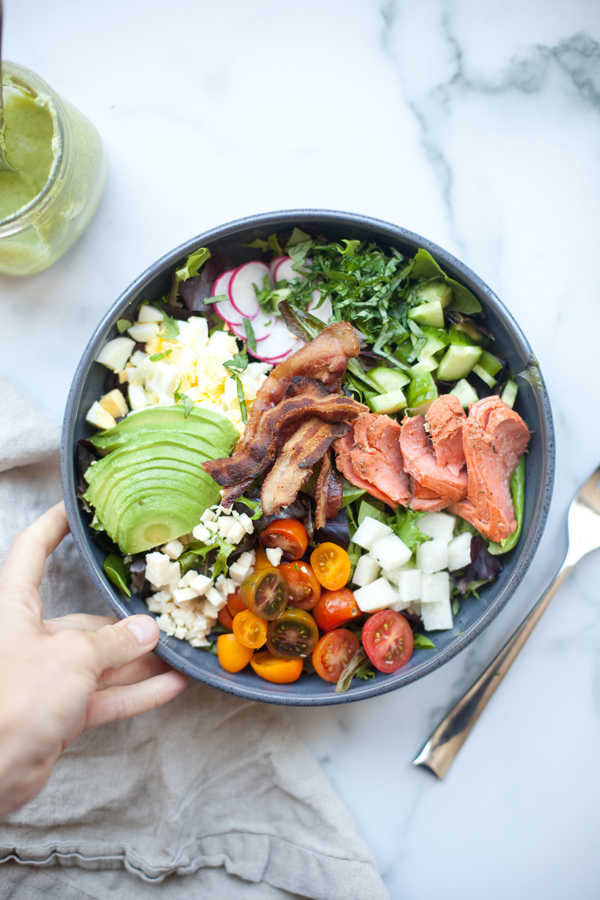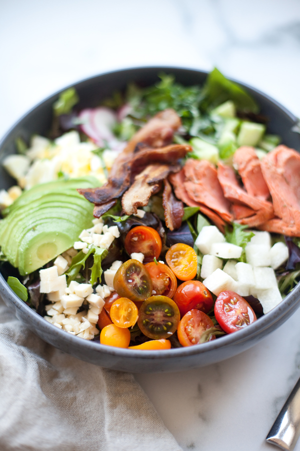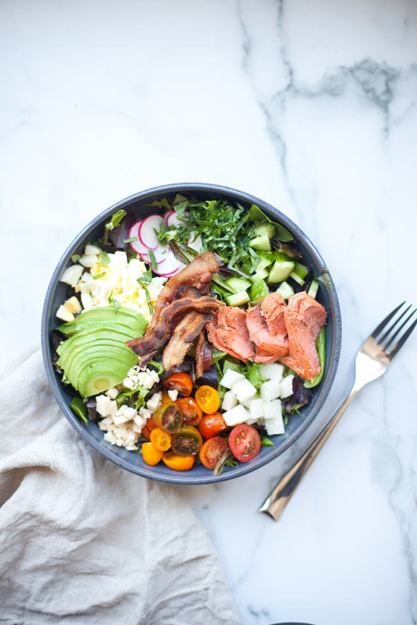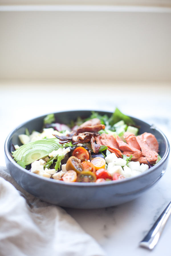 When I’m experimenting with lower carbs and higher fats, the words “Salmon” and “Cobb” both become VERY common in my kitchen. Smash them together and everything is just better… and low carb doesn’t make me want to cry anymore.