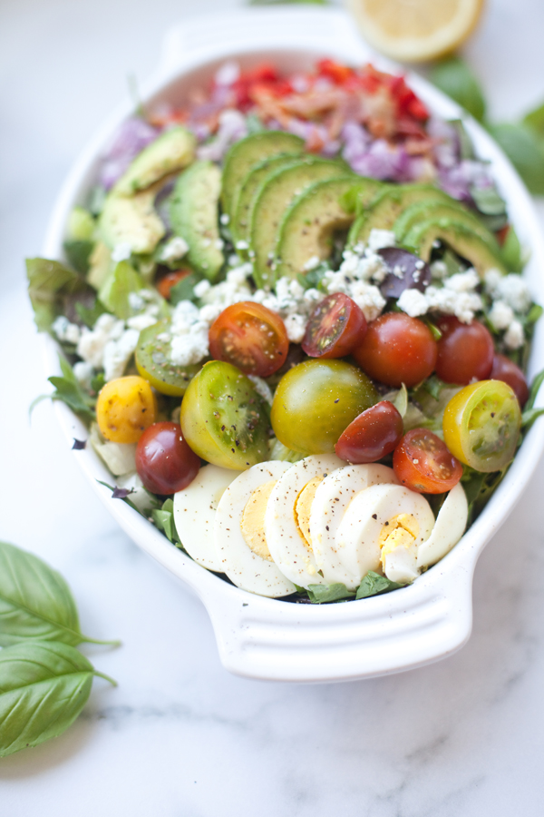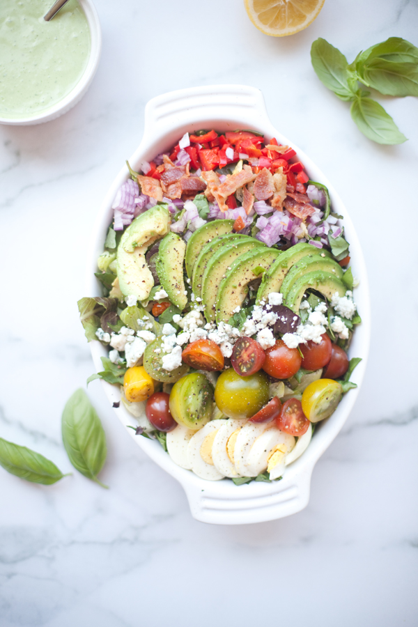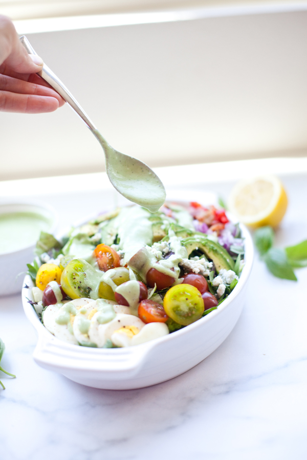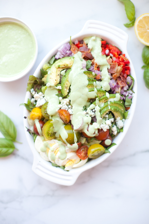 The creamy lemon basil dressing is so perfect on this Cobb, but I’ve been putting it on literally any salad I make lately. Loving it on grain salads like this farro and sweet potato one, or the summer chopped with brown rice, or this STAPLE rainbow veggie, peach summer salad of mine. It’s also amazing tucked inside a crunch wrap, or drizzled on pizzas or flatbreads!