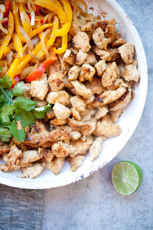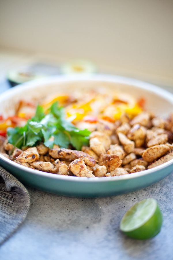 I feel like everyone should have a staple fajita chicken and veggie recipe in their rotation. It’s just pretty much the tastiest way to prep chicken in my opinion. Already chopped small, the marinade gets to soak in ALL OVER. And then with a good hot pan, you get so many good browned edges! I could hover over this pan and pop these little nuggets in my mouth ’til there’s nothing left for dinner and I’ve eaten the protein goal of a 250 pound line backer. So good.
