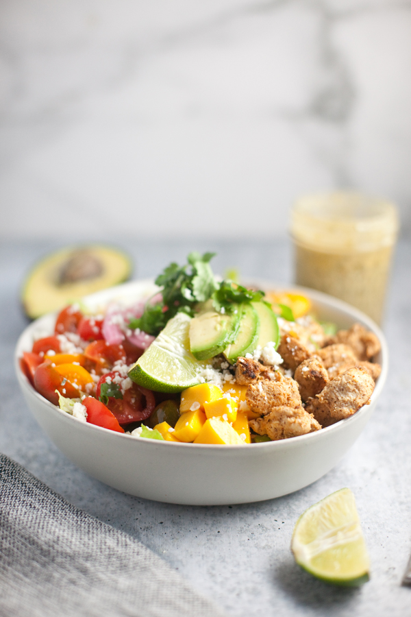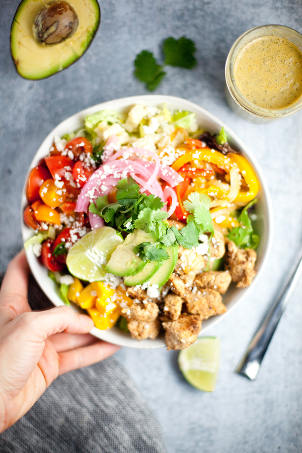 - A salad! Like this beauty. All the good stuff atop a bowl of greens. This time I made a homemade and SUPER light honey chipotle vinaigrette that I still have to perfect and post, but this lightened up cilantro lime ranch would be amazing! Or my favorite chipotle cream thinned out with some vinegar or lime juice! Or your favorite bottled dressing. Or even just plenty of fresh squeezed lime and extra veggies!