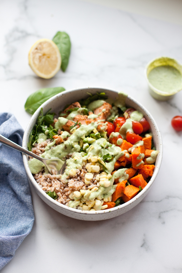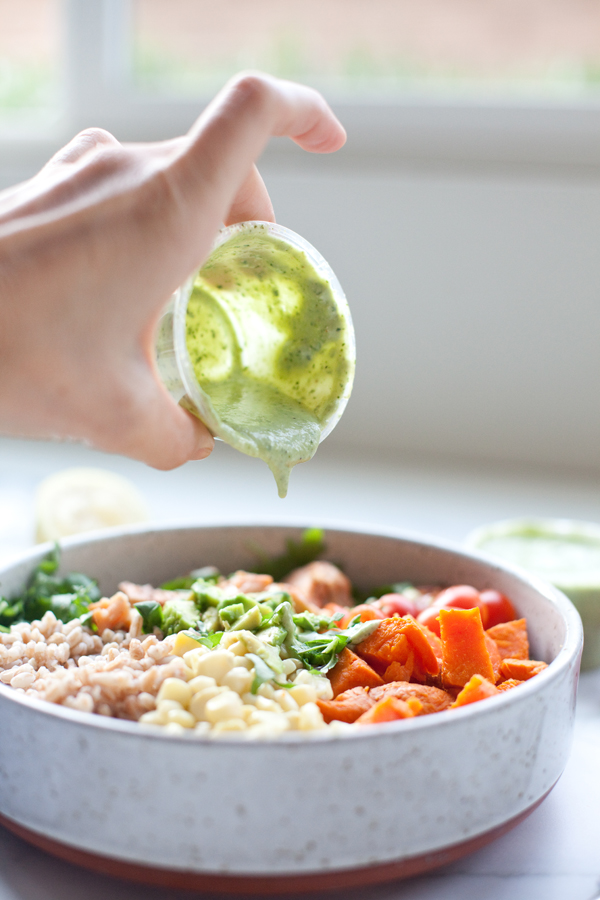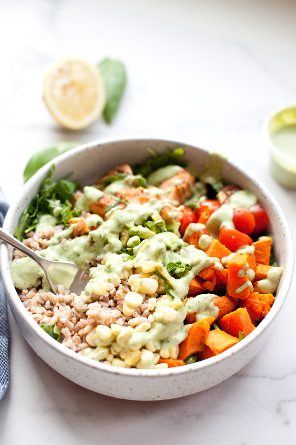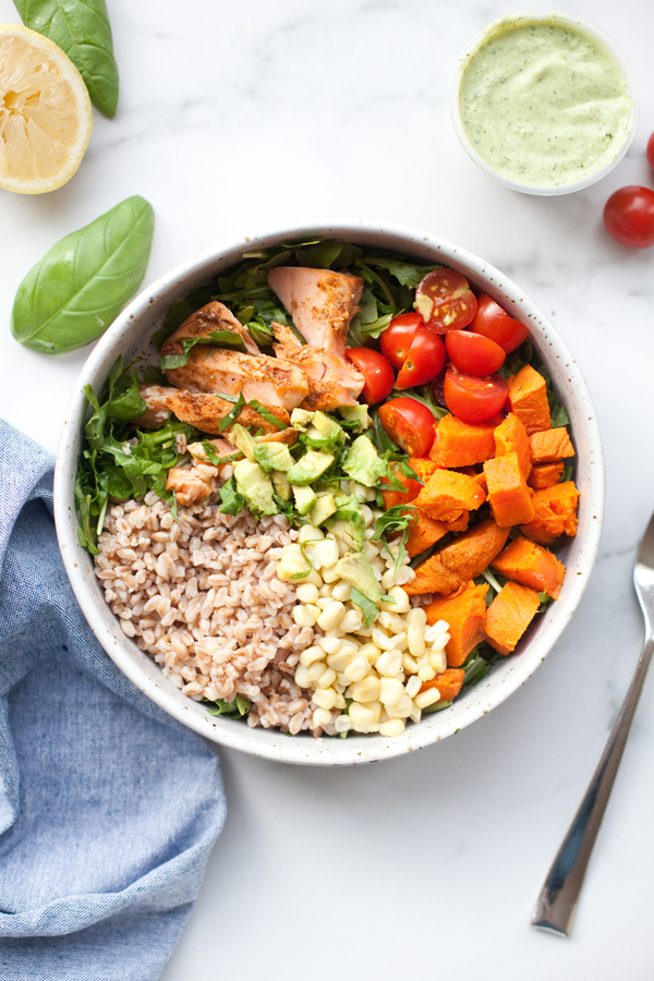 - Top with chopped sweet potato, farro, tomatoes, avocado, corn, basil, salmon… and finally the dressing.