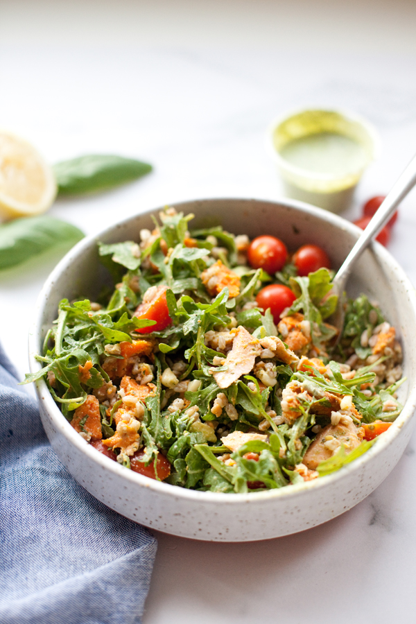This salad! I can’t stop. Farro, baked sweet potato, arugula, plus corn and avocado… topped with blackened salmon and this creamy jalapeno avocado dressing I could drink. It’s MY FAVORITE. There is something special about all the yummy, healthy carbs in once place. It’s WORTH IT. Trust me.