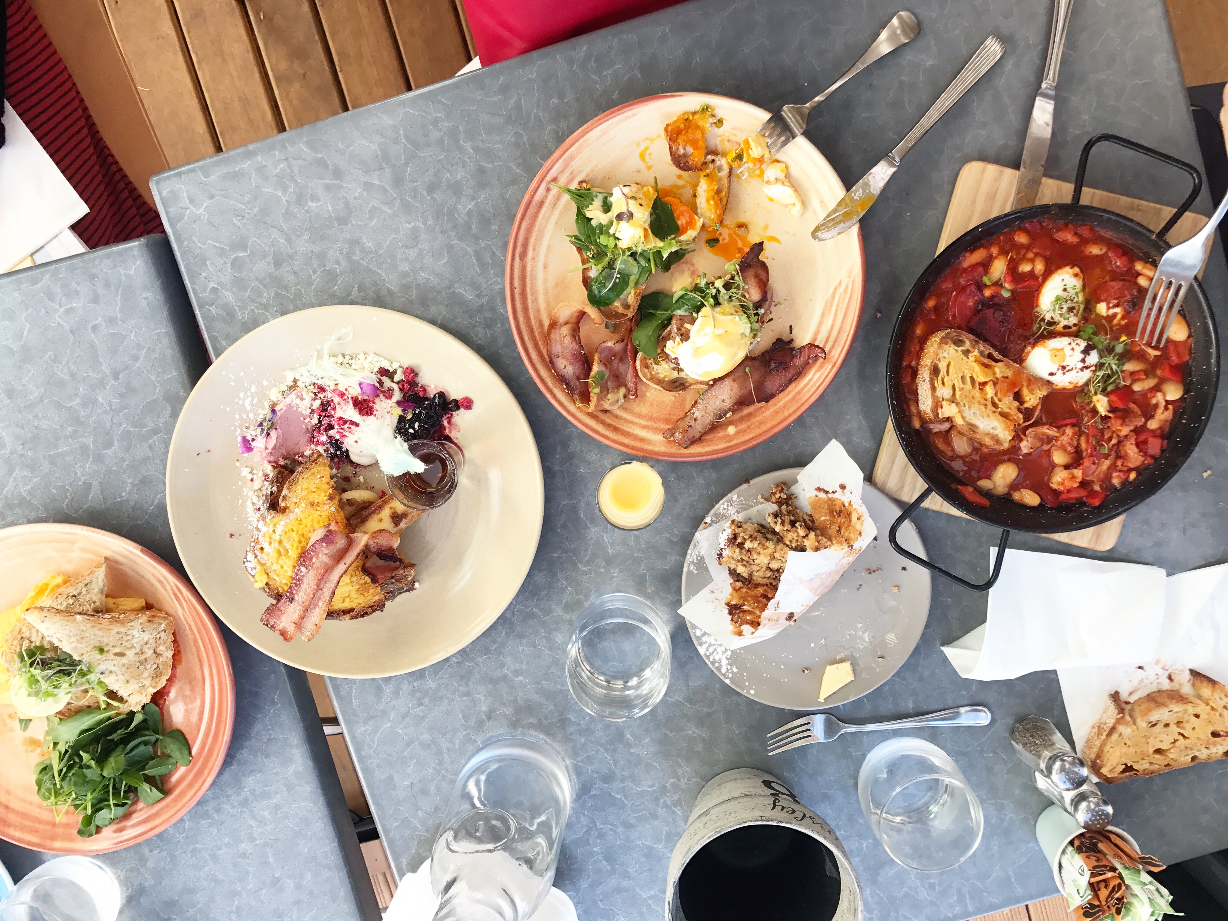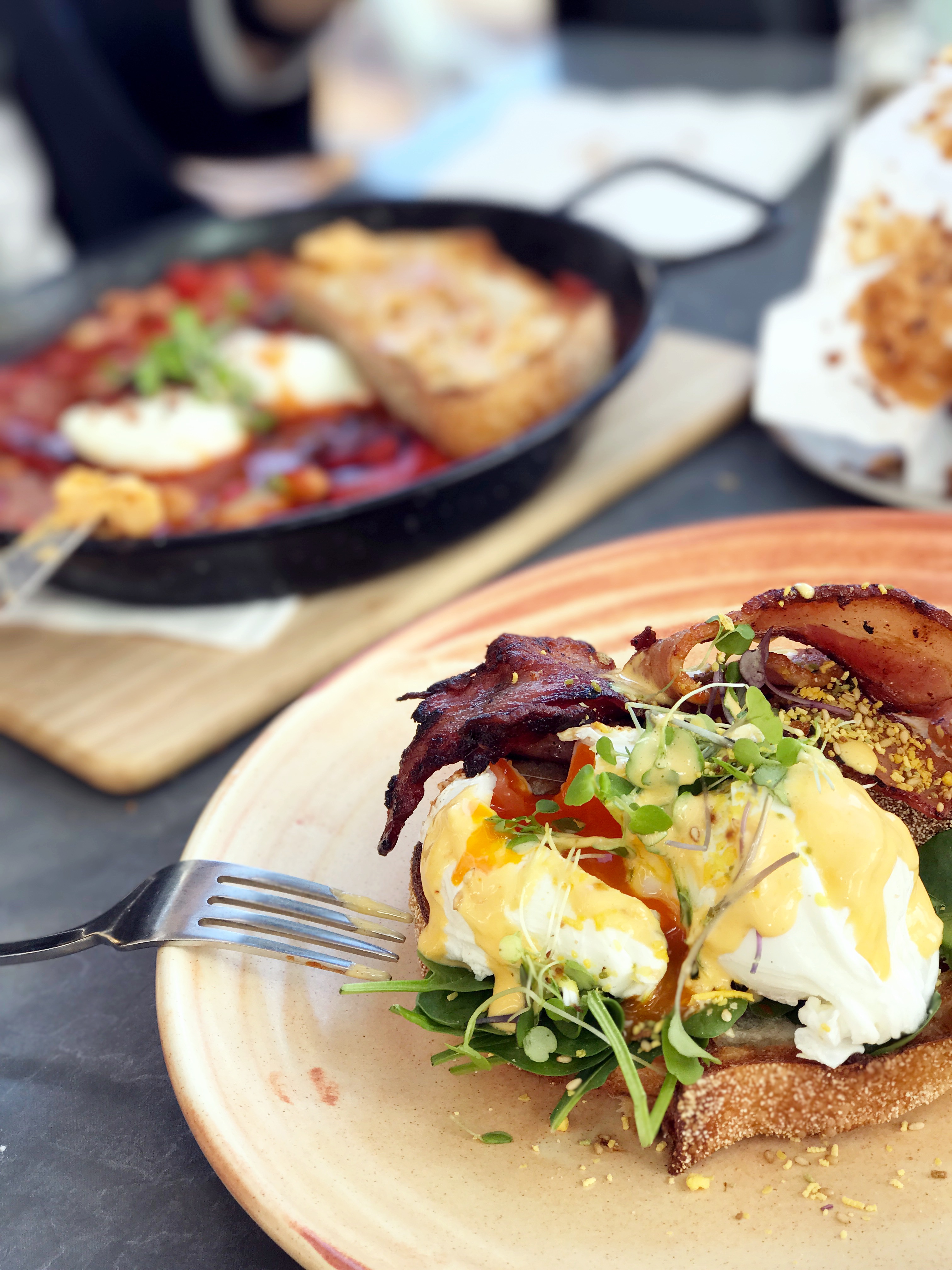 This was us in New Zealand – while I still tracked pretty legit. Eggs benedict is a go-to fancy, delicious vacation brunch for me that’s still trackable. Hollandaise on the side for total control so I can drizzle just 5-10 grams… less than a tbs… two poached eggs, a piece of bacon and a thick slice of toast. Those are all things I felt pretty confident eye-balling.