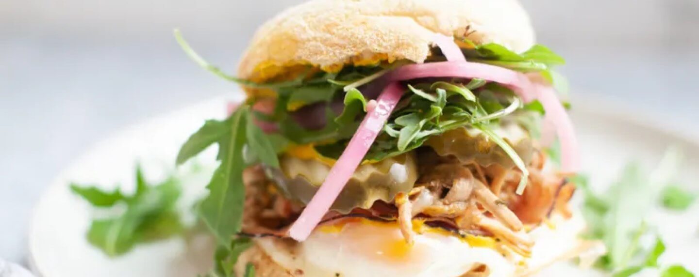 - Toast the english muffin. Spread with yellow mustard and honey mustard. Top with the cheesy pork, the warm ham, and the fried egg. Add pickles and pickled onions if you love them! I always add some arugula and fresh mint if I’ve got it!