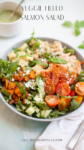 This salad has some of my MOST favorite flavors piled into one bowl. Rosemary roasted sweet potatoes, sweet chili salmon and the lightened up creamy chimichurri. I’m in love with all three. I could fill my whole BOWL with the sweet potatoes. But those carbs would climb fast, so the 50 grams is just enough to give me my fix! If you’d rather skip them, the roasted sweet potatoes make up about 17 of the carbs in this salad.