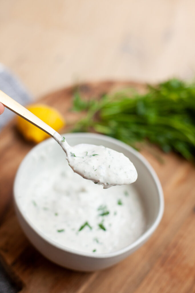 Go ahead and pop it in the fridge until you’re ready to use. It starts out nice and thick, so feel free to thin it out a littler with more vinegar or milk if you prefer. But without much fat in there, it tends to get a little watery the next day. (which is why it’s best day one!)