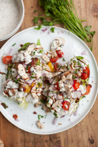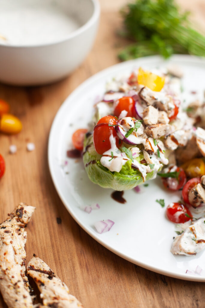 A wedge salad is so simple to throw together, and yet since I associate it with fancy steak houses, it always feels so fancy! This wedge salad with creamy blue cheese dressing is seriously one of our favorites. So simple, tasty, crisp, and of course, macro friendly. Perfect as a side to our grilled Sunday meats…. or I love to make it a meal with some grilled chicken on top all week long!